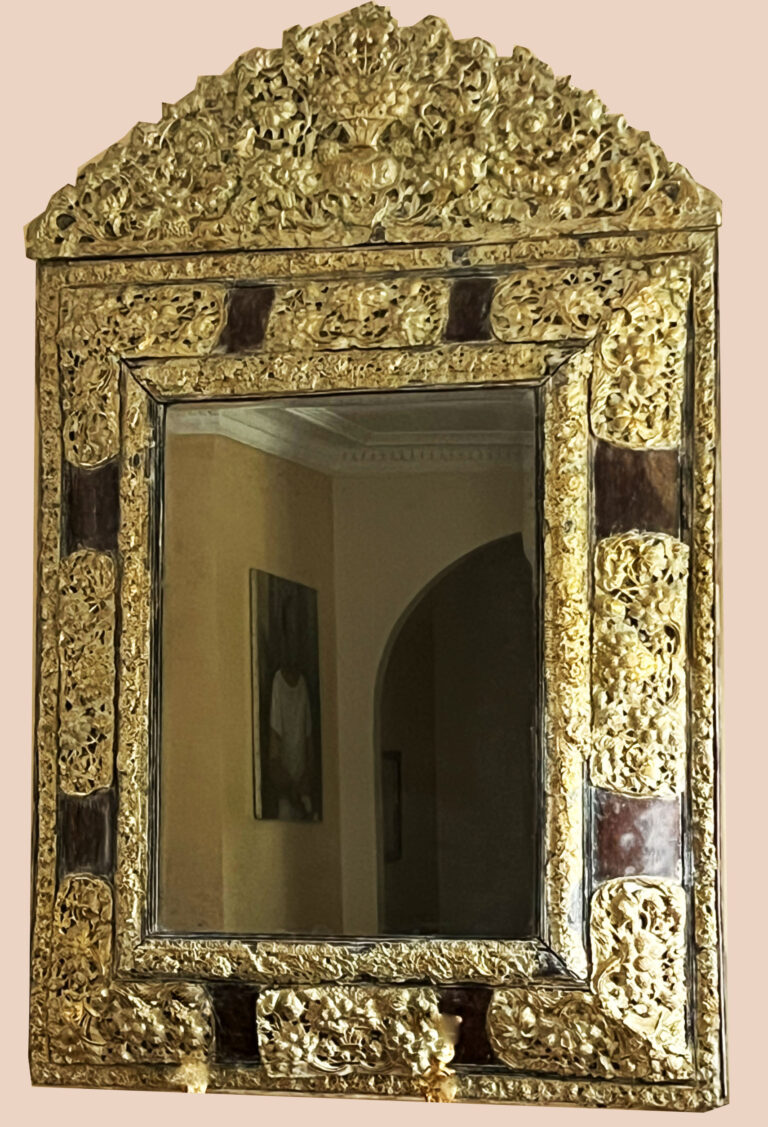 Miroir à fronton en bois et cuivre estampé doré, XVIIe