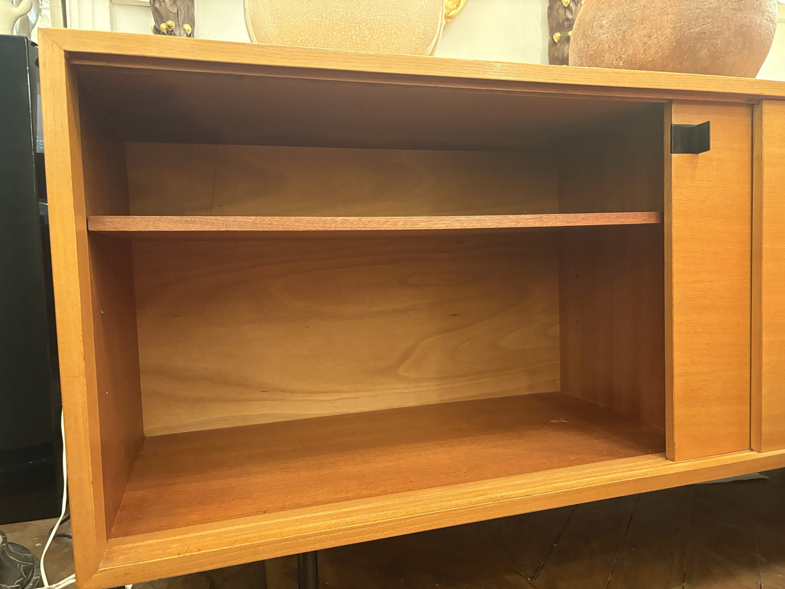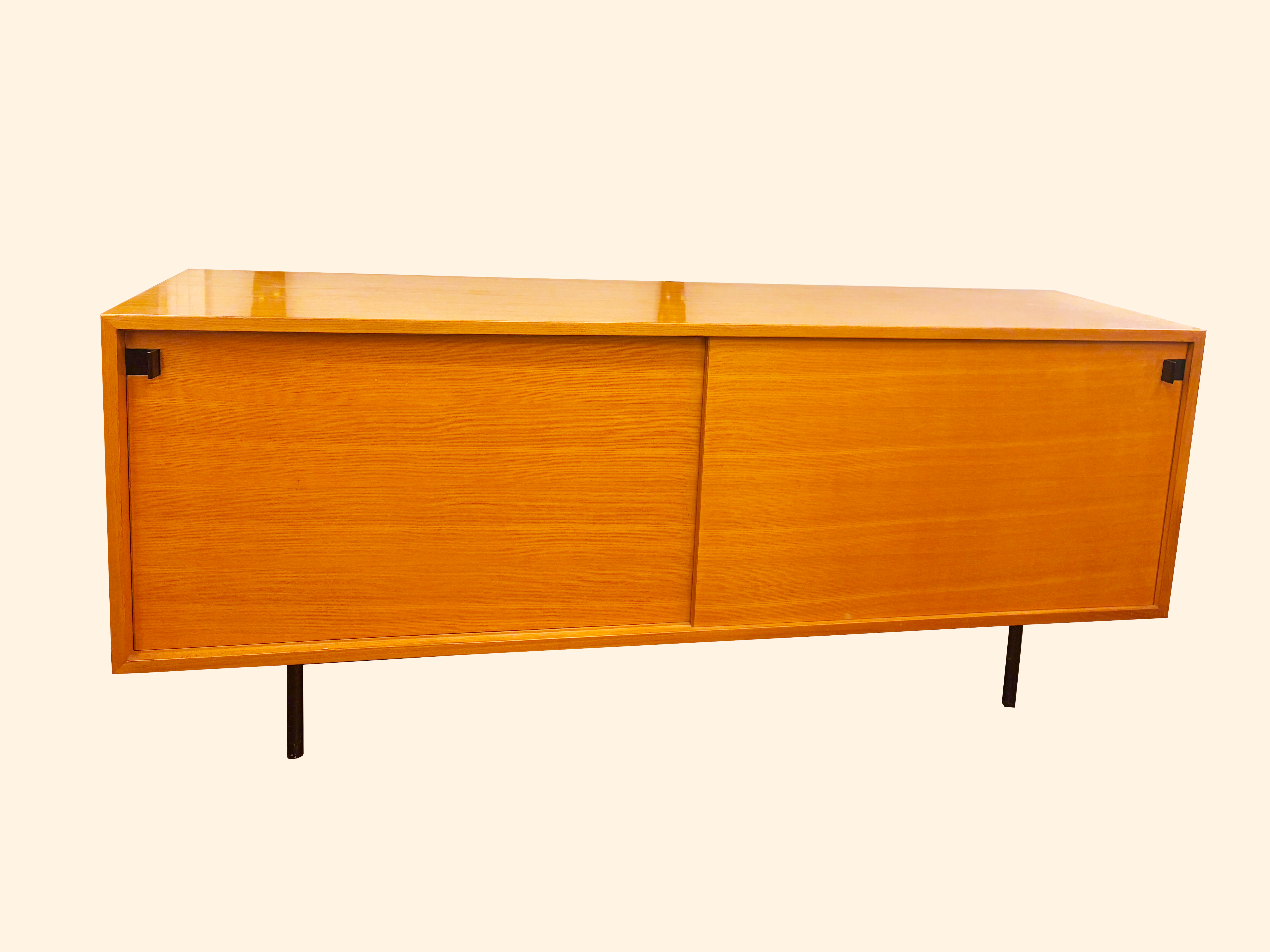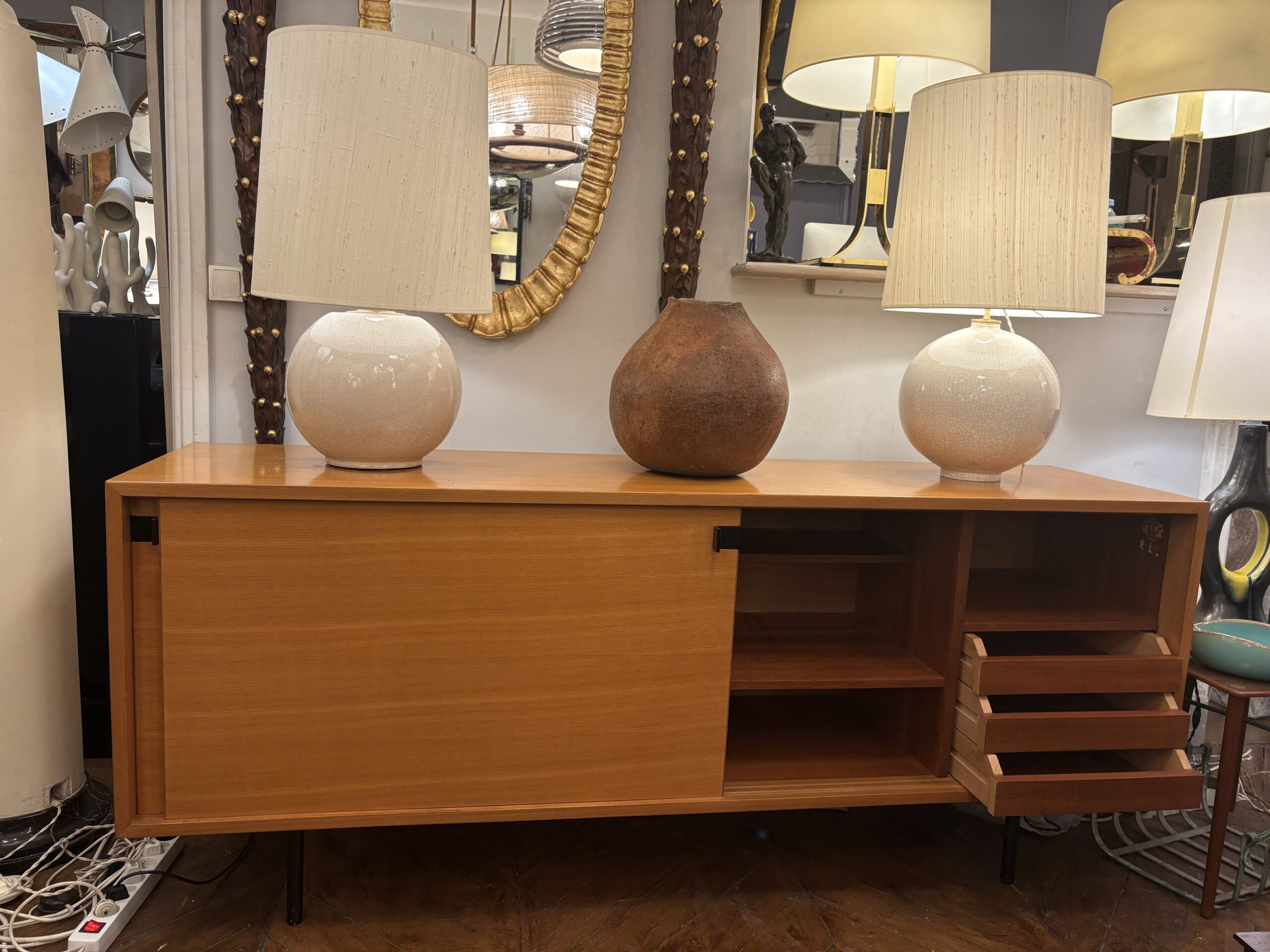Enfilade d’Alain Richard (1926-2017) édité par la société Meubles TV dans les années 50. Sur un piétement en métal laqué noir, la structure en placage d’orme s’ouvre sur plusieurs étagères et tiroirs grâce à deux portes coulissantes. Le modèle 196 est une référence rare qui s’inscrit dans la vision de son créateur, où la rigueur s’allie à une esthétique moderne, dans la continuité des productions françaises des années 50. La marque de l’éditeur est visible