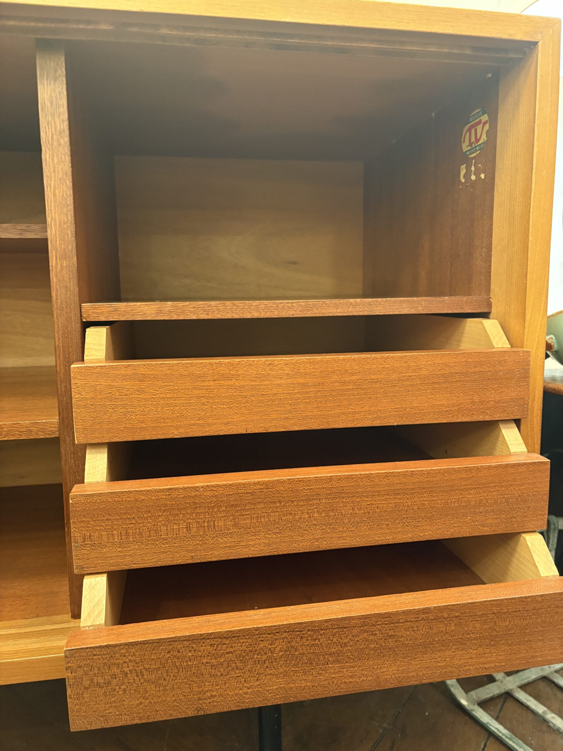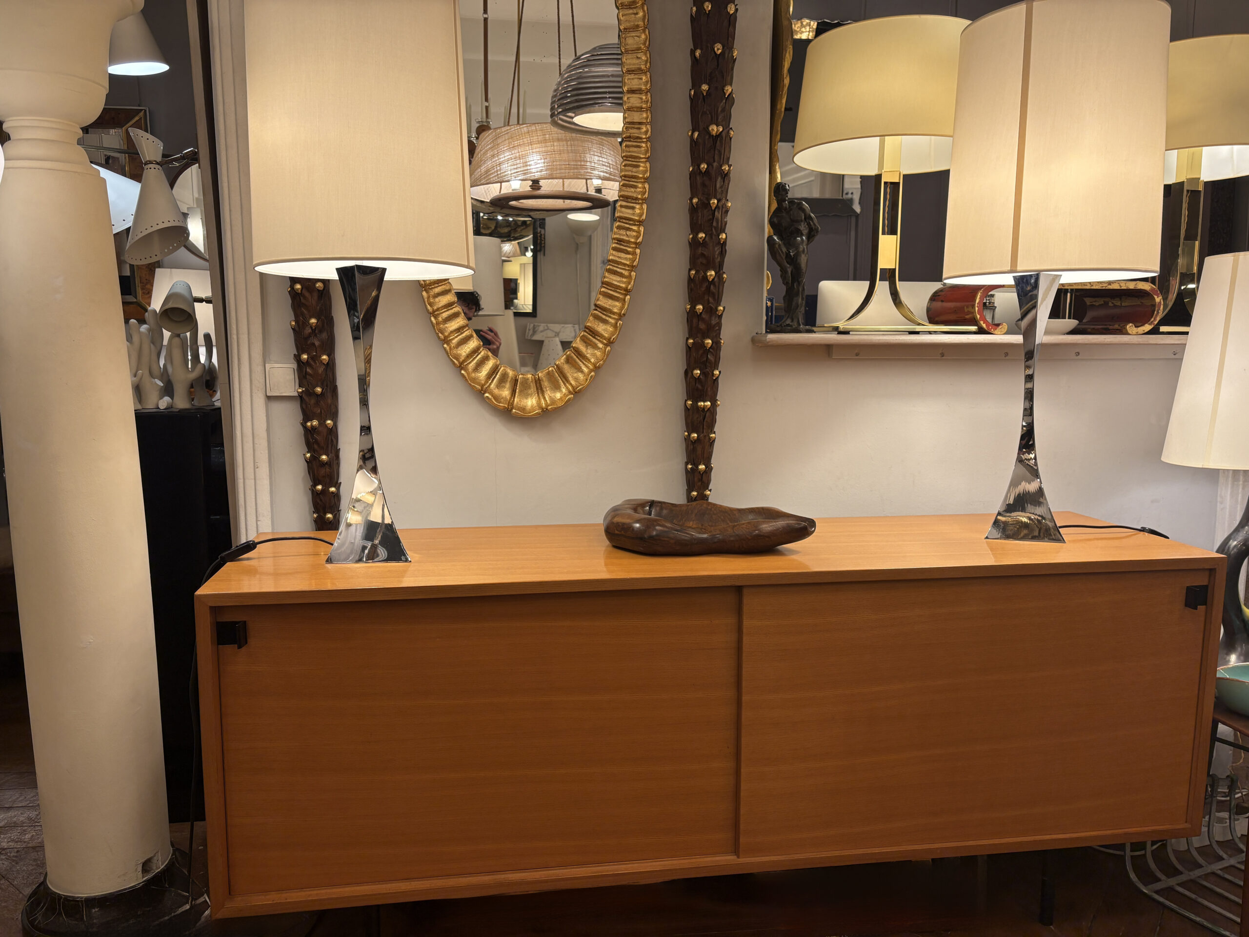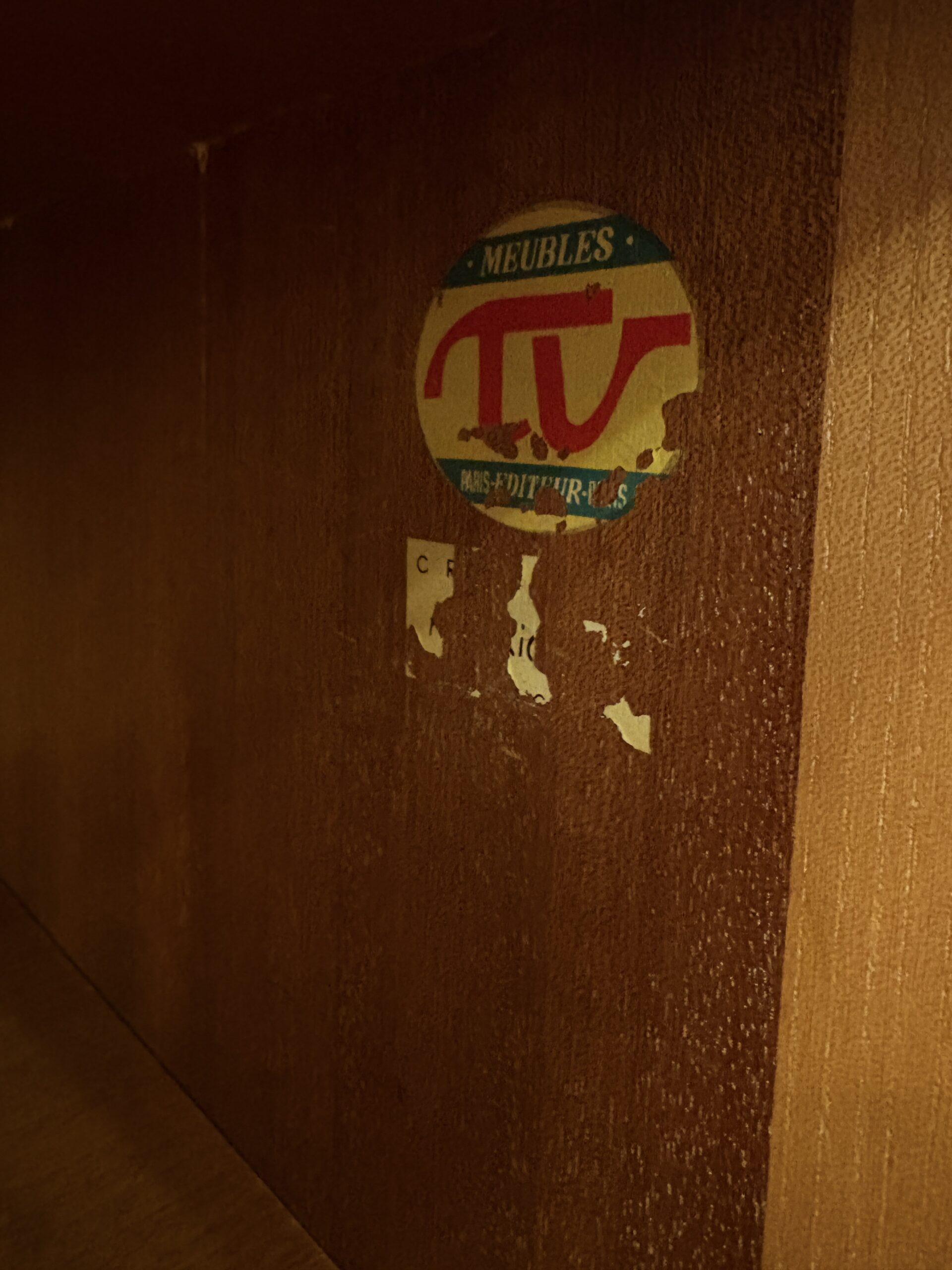 Enfilade d’Alain Richard (1926-2017) édité par la société Meubles TV dans les années 50. Sur un piétement en métal laqué noir, la structure en placage d’orme s’ouvre sur plusieurs étagères et tiroirs grâce à deux portes coulissantes. Le modèle 196 est une référence rare qui s’inscrit dans la vision de son créateur, où la rigueur s’allie à une esthétique moderne, dans la continuité des productions françaises des années 50. La marque de l’éditeur est visible