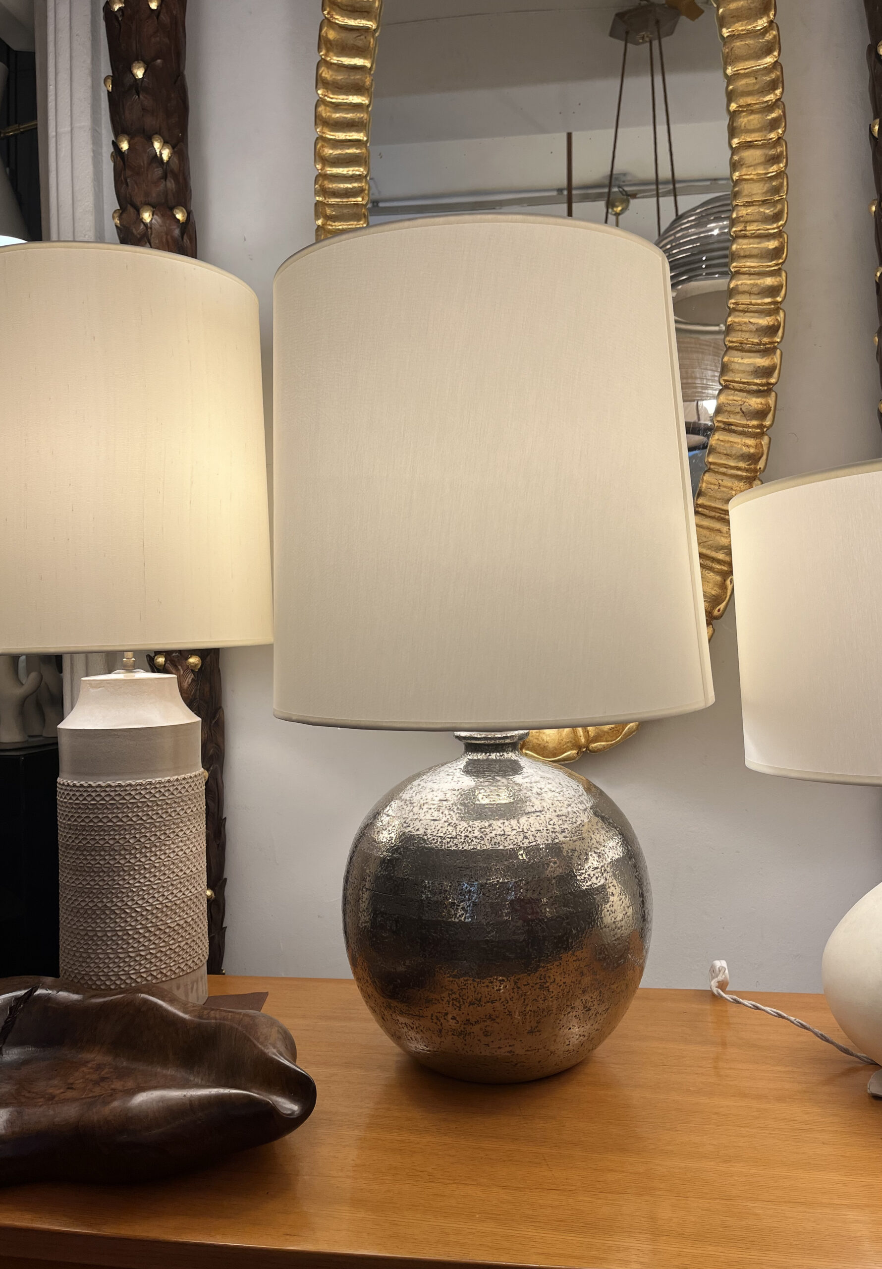 Lampe ronde en céramique argenté, circa 1970