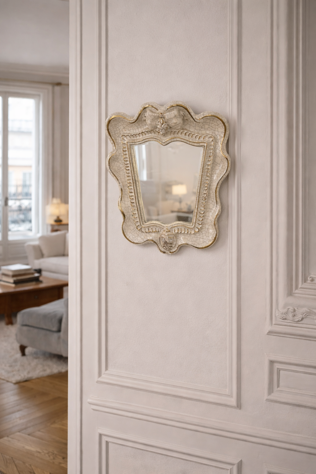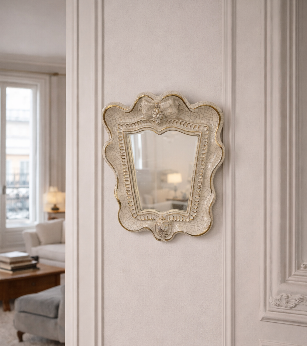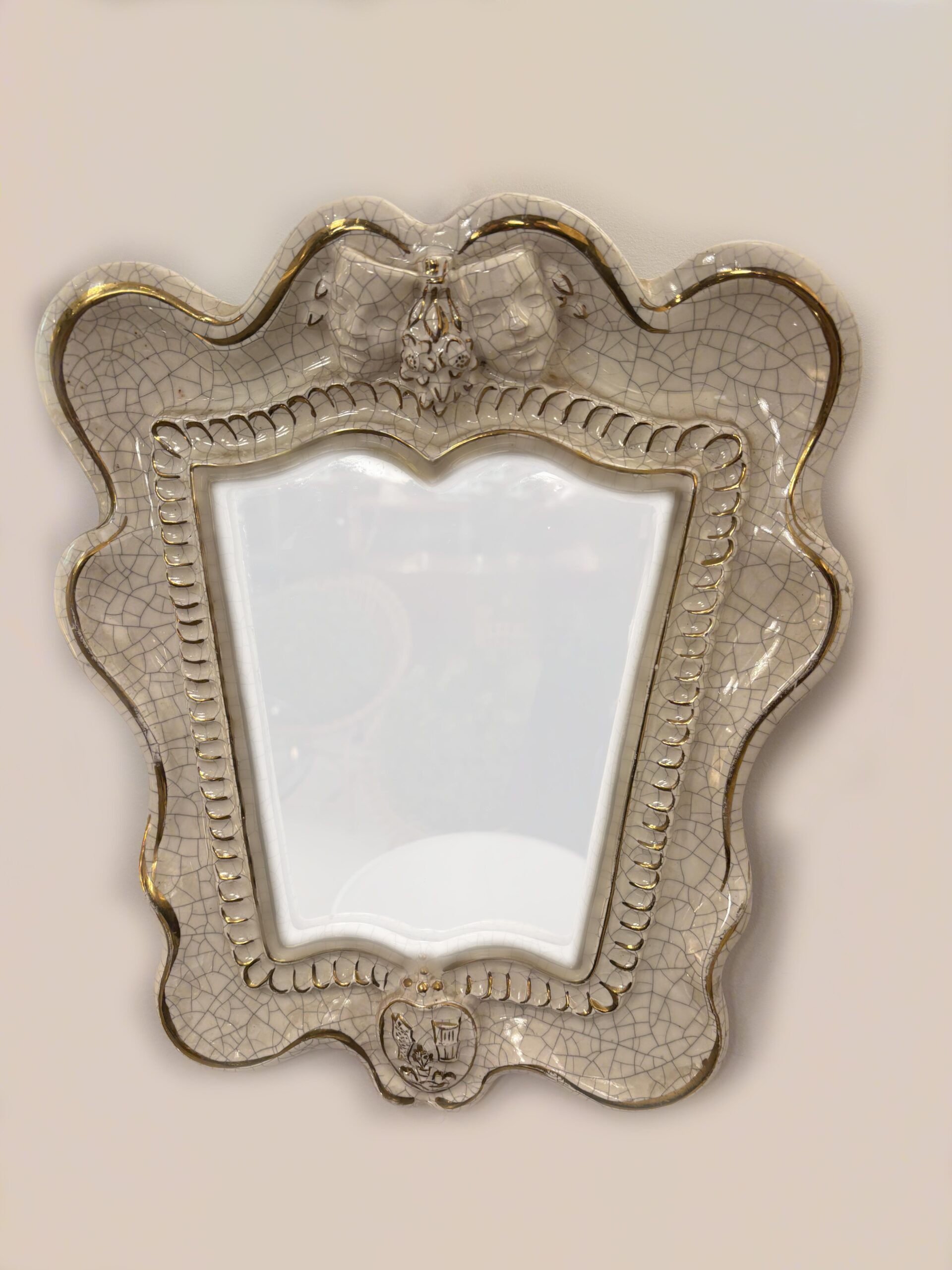 Miroir en céramique craquelée blanche et or, dit miroir théâtre design Gmundner Keramik, Autriche, circa 1940