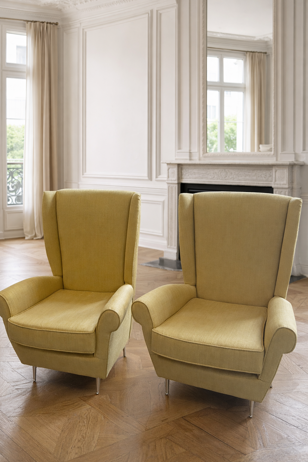 Paire de fauteuils jaune à oreilles, dans le style de Gio Ponti.