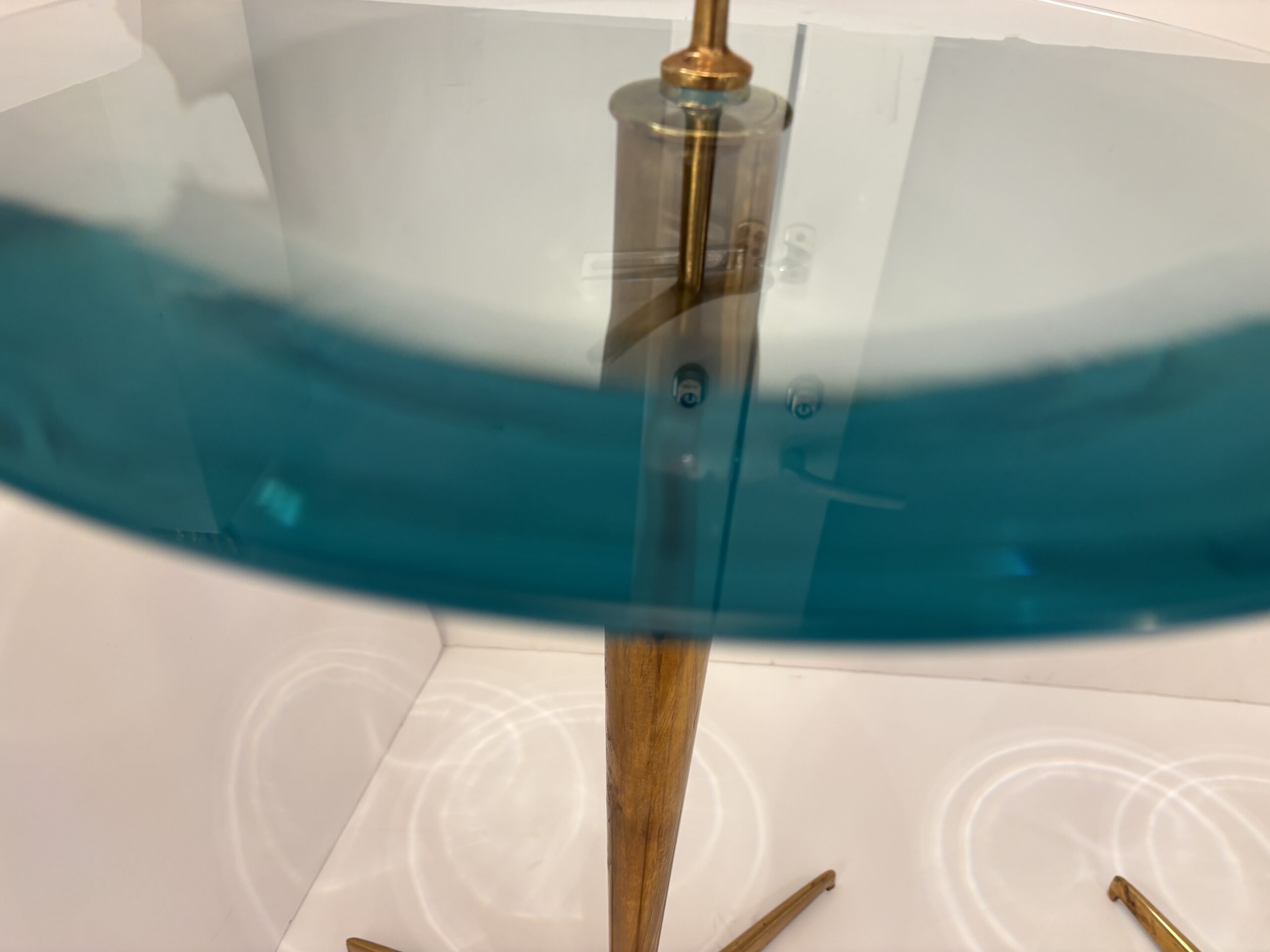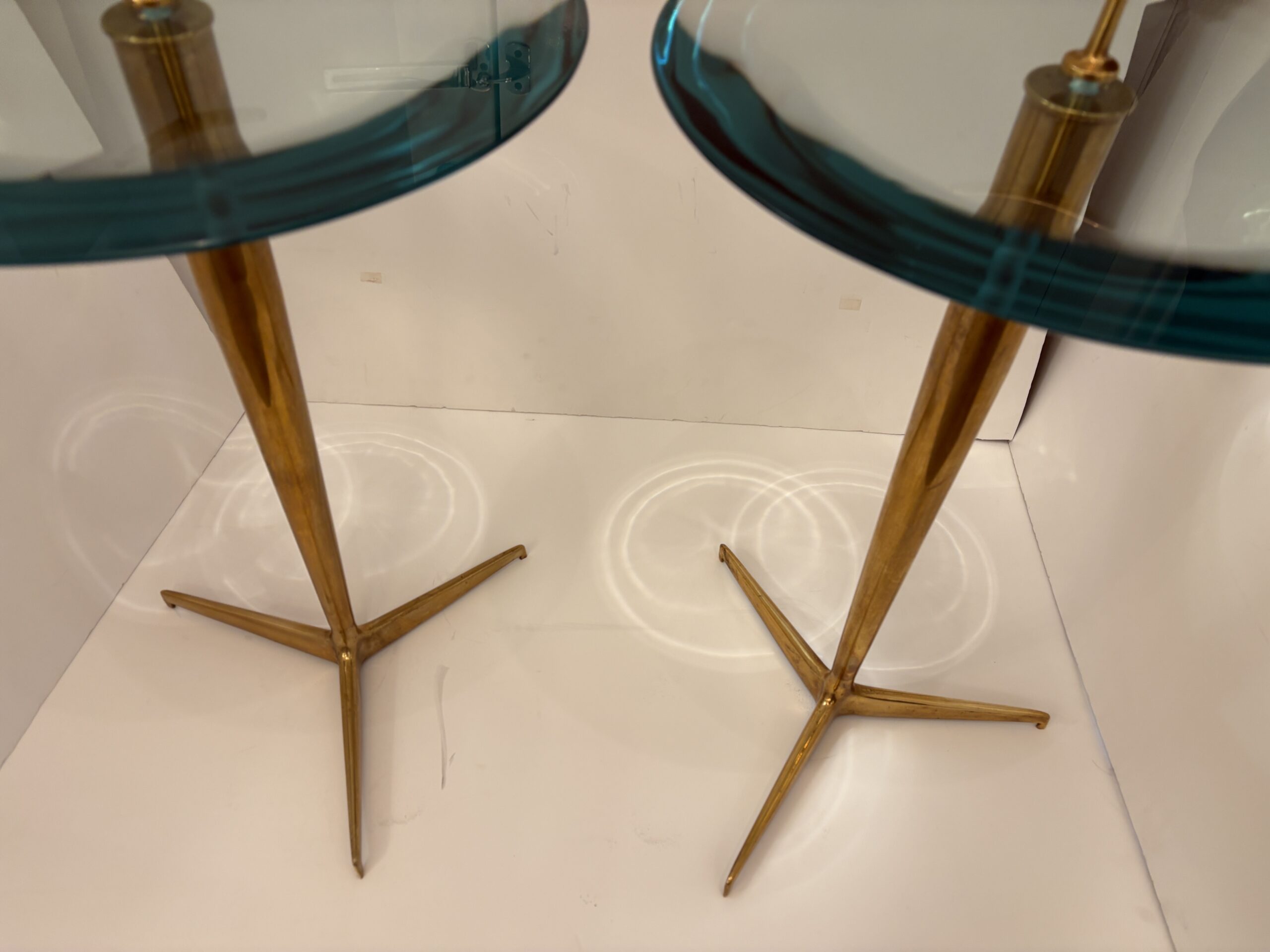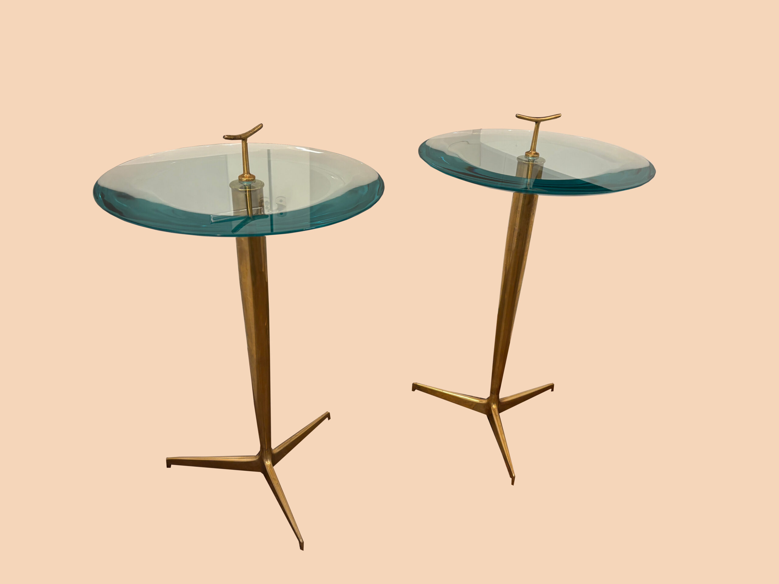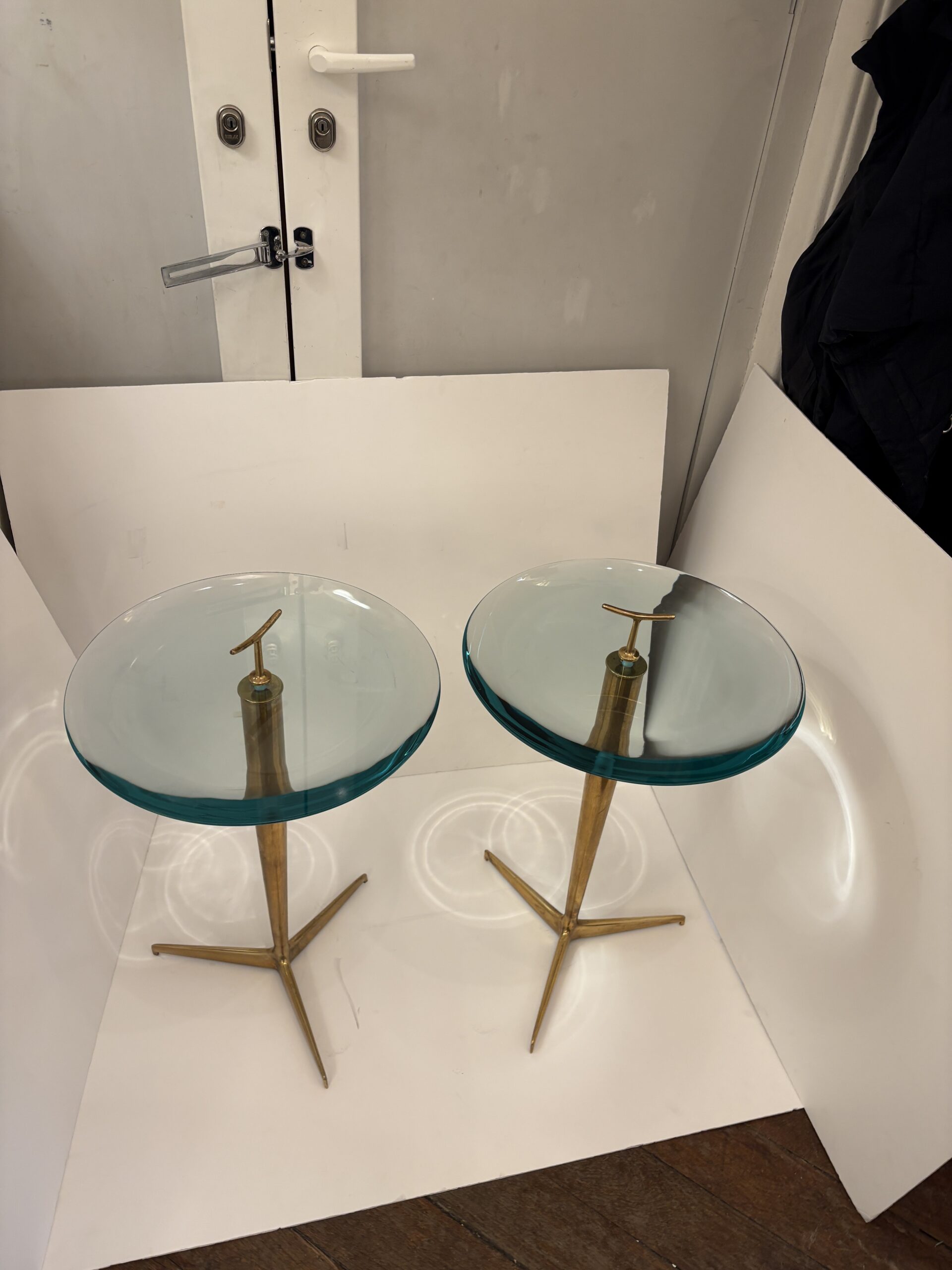 Paire de tables d’appoint avec verre « lentille » et pied laiton, Giuseppe Ostuni, circa 1960, Italie.
