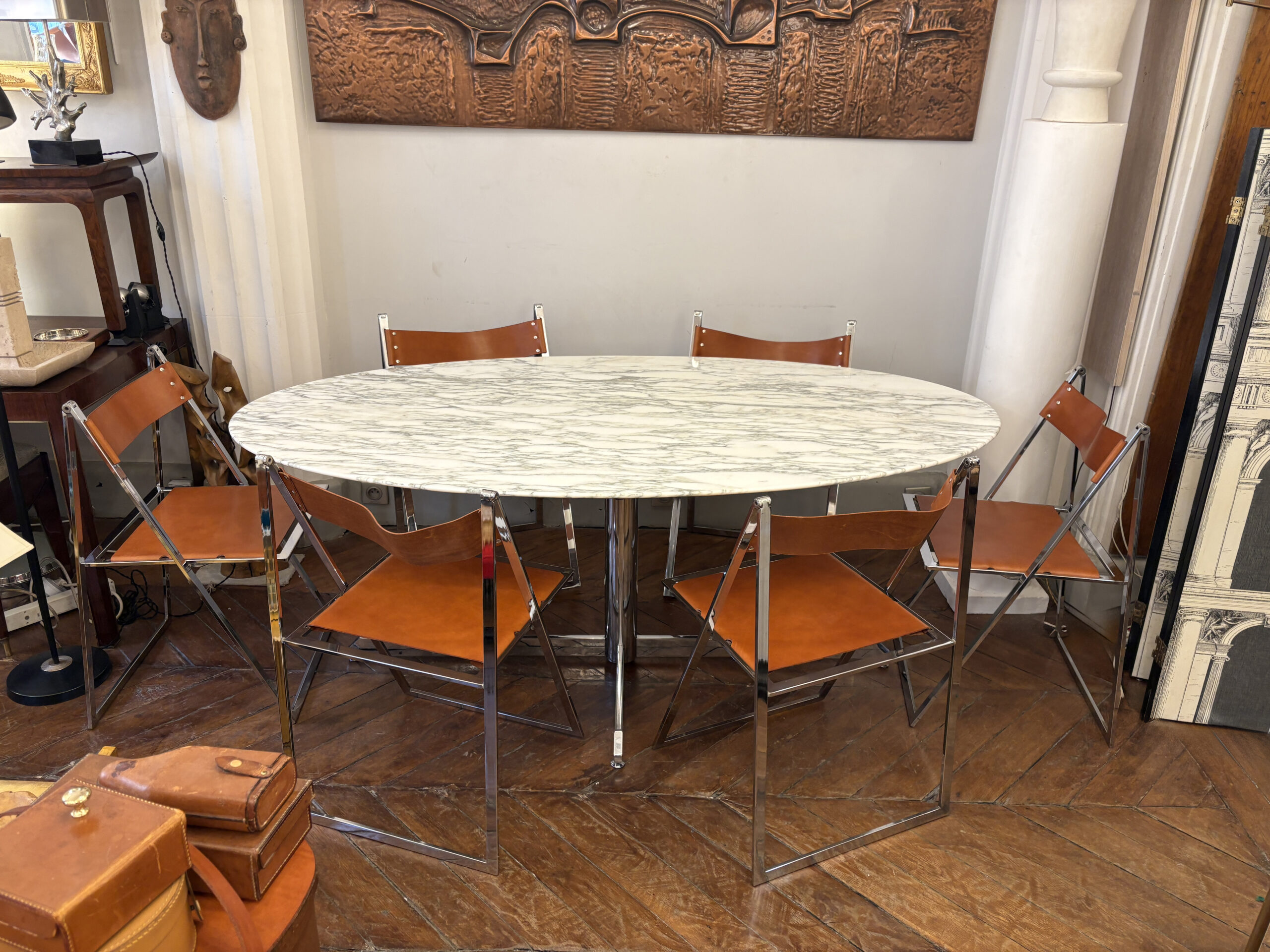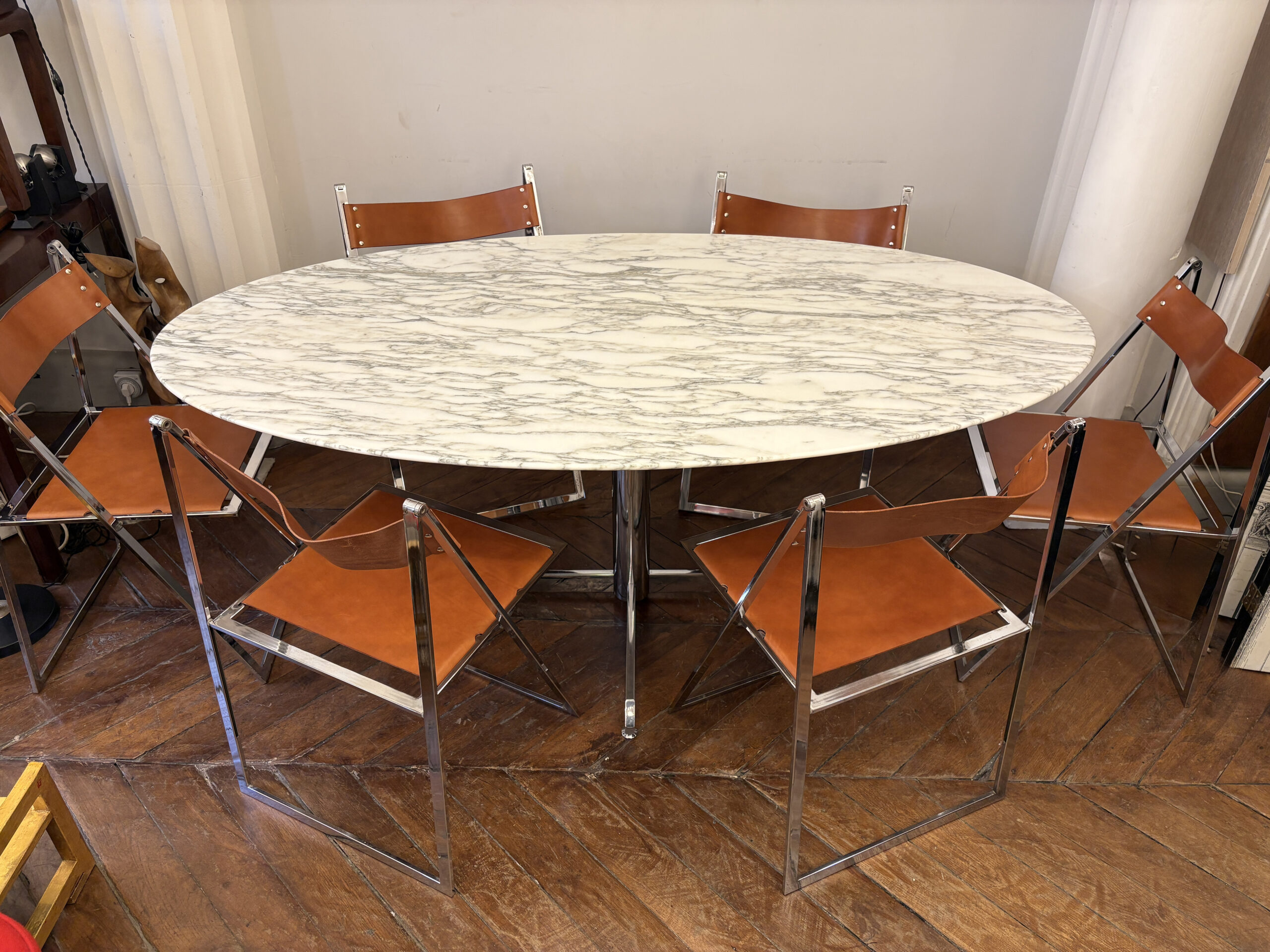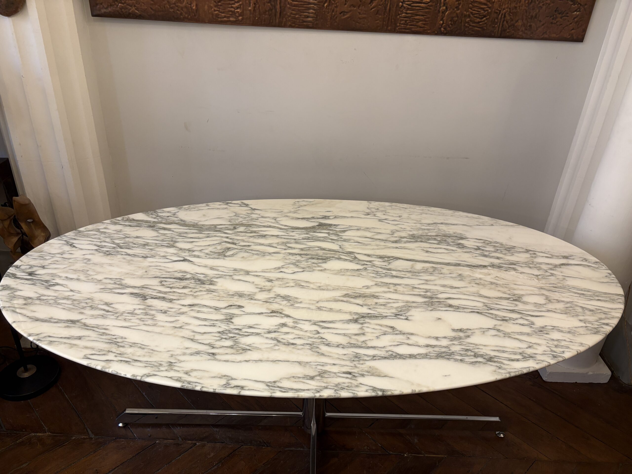 Table ovale Roche Bobois 1969 Plateau en marbre de Carrare pied en metal chromé